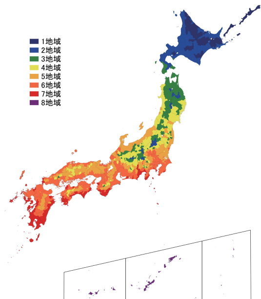 建築物省エネ法に基づき全国が「1地域〜8地域」に区分されています。